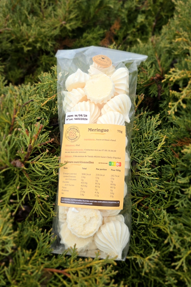 Les meringues sont préparées artisanalement pour offrir une texture à la fois croquante et aérienne, qui fond délicatement en bouche. Avec leur douceur légère et leur saveur subtile, elles accompagnent parfaitement un café, un dessert ou se dégustent seules pour une petite pause sucrée. Une gourmandise simple, élégante et irrésistible.