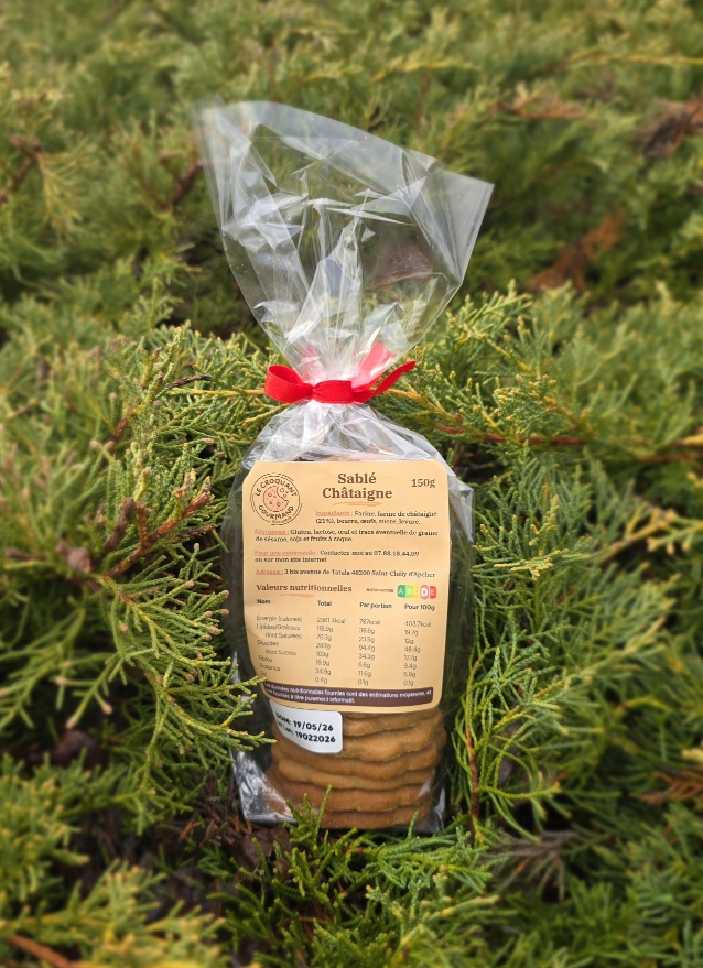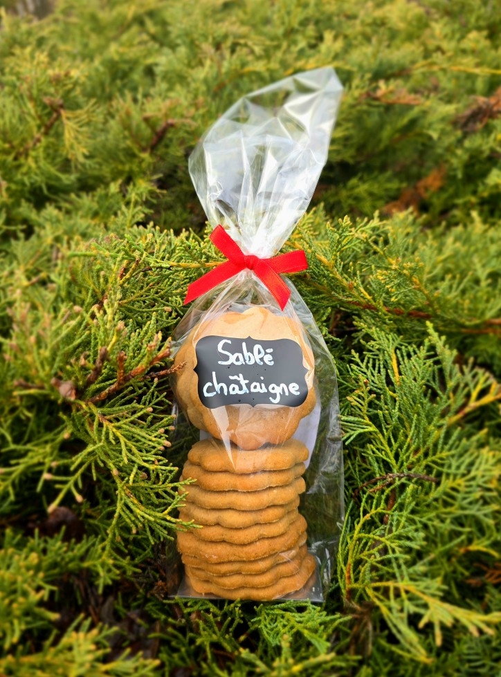 Découvrez nos sablés à la châtaigne, élaborés artisanalement avec de la farine de châtaigne qui leur apporte une saveur douce et légèrement sucrée. Leur texture fondante et leur parfum délicat en font une gourmandise réconfortante, idéale pour l’automne comme pour les petites pauses cocooning. Simples, naturels et savoureux, ils séduiront les amoureux de la châtaigne comme les curieux.